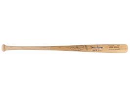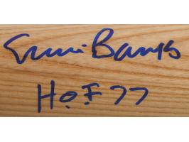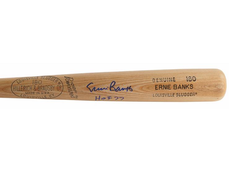 Official Hillerich & Bradsby Louisville Slugger 'Ernie Banks'-model baseball bat, signed in blue felt tip on the barrel, "Ernie Banks, HOF 77." In very fine condition, with a Beckett authentication label affixed to the knob.