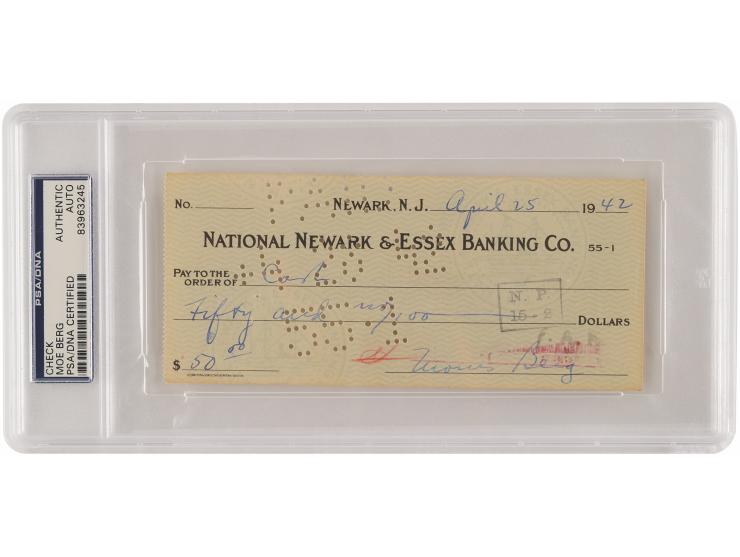 National Newark & Essex Banking Co. check, 6.25 x 2.75, filled out and signed by Berg, "Morris Berg," payable to Cash for $50, April 25, 1942. In fine condition. Encapsulated in a PSA/DNA authentication holder.