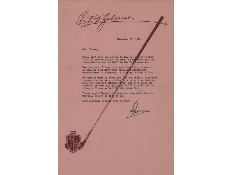 TLS signed “Babe,” one page, 7 x 10.5, personal letterhead, November 20, 1954. Letter to M. L. Finneburgh, in part: "Well, ole' boy, the aerial is in, but I don't think that the connection is too good, as we don't get the reception that we should from the fennie-aerial. How are you? I hope that your long trip is now at an end, as I do know what traveling around the country does to a person…We sure do want to thank you for the aerial. Everyone thought that we were putting in a television station when they started putting it up, and were quite interested in what was going on, until I told them that it wa[s] a Finney Aerial for the television." In fine condition, with staple holes to the upper left corner. Accompanied by the original mailing envelope.