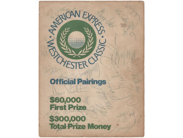 Program from the 1976 American Express Westchester Classic, two pages, 8.5 x 11, signed on the front cover in blue ballpoint by twenty golfers, including: Arnold Palmer, Chi Chi Rodriguez, Ed Sneed, Hubert Green, Jerry McGee, Dave Stockton, Eddie Pearce, Lou Graham, Fuzzy Zoeller, Rik Massengale, and others. In very good condition, with toning and staining, a crease to the lower right corner, and a short tear to the bottom edge.