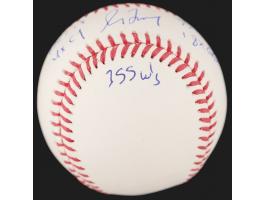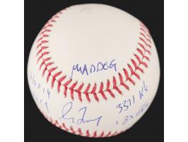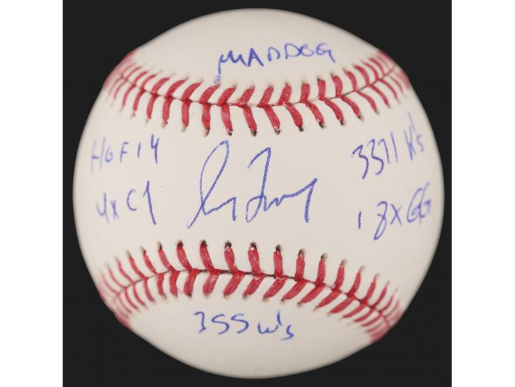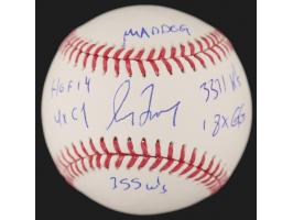 Official Rawlings Major League (Manfred) baseball signed in blue ballpoint on the sweet spot by Greg Maddux, who adds his nickname and career statistics: "Maddog," "HOF 14," "4x CY," "3371 K's," "18x GG," and "355 W's." In very fine condition, with a Beckett authentication label affixed to the rear.