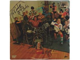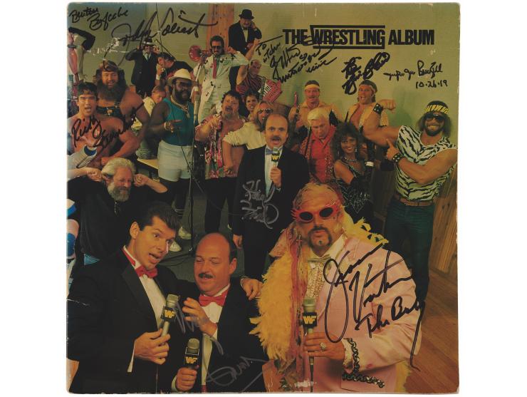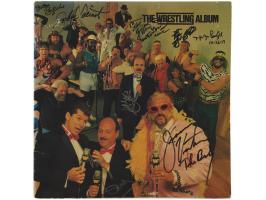 The Wrestling Album signed on the front, back, and gatefold in ink by Gene Okerlund, Jesse Ventura, Roddy Piper, The Iron Sheik, Nikola Volkoff, Jimmy Hart, Barry Windham, Mike Rotundo, Bob Orton, Hulk Hogan, George 'The Animal' Steele, Paul Orndorff, Brutus Beefcake, Johnny Valiant, Greg Valentine, B. Brian Blair, Jim Brunzell, Howard Finkel, and Ricky Steamboat. In fine condition, with some light wear along the spine. The record is included.