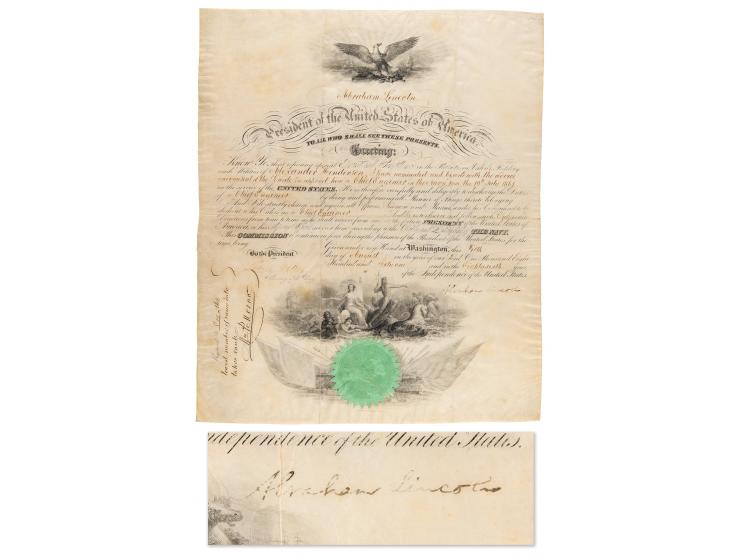 Uncommon Civil War–dated partly-printed vellum DS as president, 14.25 x 17.25, August 5, 1861. President Lincoln, "by and with the advice and consent of the Senate," appoints Alexander Henderson as "a Chief Engineer in the Navy." Signed at the conclusion in ink by Lincoln and countersigned by Secretary of the Navy Gideon Welles. The green seal affixed at the bottom remains intact. In very good to fine condition, with Welles' signature very faded, and irregular ink adhesion to Lincoln's. Naval appointments are far scarcer than other military appointments made by President Lincoln. Consignor notes that this originates from the noted Lincolniana collection of the late Dr. Arthur C. Hansen.