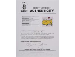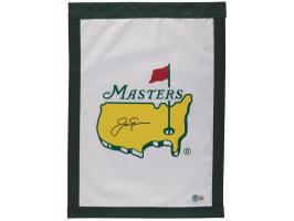 Attractive white-and-green Masters garden flag, 13 x 18, featuring the golf tournament's logo imprinted at the center, signed in black felt tip by six-time Masters winner Jack Nicklaus. In very fine condition, with a Beckett label affixed to the lower right corner. Accompanied by a full letter of authenticity and grading from Beckett Authentication Services, evaluating the autograph as a "10."