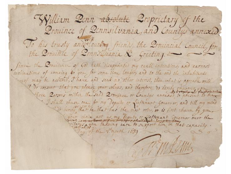 Scarce partial manuscript DS, signed “Wm. Penn,” one page, 9.25 x 7, September 1689. Document headed "William Penn…Proprietary of the Province of Pennsilvania [sic], and Counties annexed," by which he requests that three candidates be presented to him as potential contenders for his Deputy or Lieutenant Governor. In part: "Since the Providence of God hath disappointed my reall intentions, and earnest inclinations of comeing to you for some time longer, and to the end the inhabitants…may be assured, I have and seek no other interest, then what is agreeable…I do consent that you please your selves, and therefore do hereby empower you…three Persons within the said Province or Countys annexed, to present to me…I shall chuse one for my Deputy or Lieutenant Governor." Docketed on the reverse, "A draught of a Commission—to impower the Councel to choose his Govenr." In good to very good condition, with overall soiling, professional repairs to tears, and professional restoration to the lower missing left corner area, affecting some of the text but not the signature. A significant, early document from the decade in which Pennsylvania was founded.