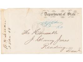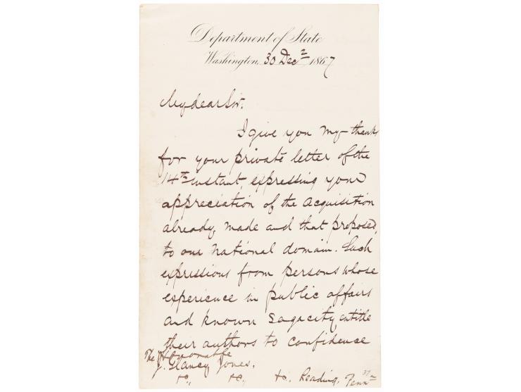 LS signed “William H. Seward,” one page both sides, 5 x 8, Department of State letterhead, December 30, 1867. Letter to the Hon. J. Glancy Jones, thanking him for comments in relation to the recent purchase of Alaska, and alluding to a proposal for the acquisition of British Columbia. In full: "I give you my thanks for your private letter of the 14th instant, expressing your appreciation of the acquisition already made and that proposed, to our national domain. Such expressions from persons whose experience in public affairs and known sagacity entitle their authors to confidence would, it seems to me, be useful and instructive in a form in which they could be promulgated without violating the restrictions imposed upon private letters." In fine condition. Accompanied by the original mailing envelope, retaining its red "Department of State" wax seal on the reverse.