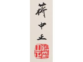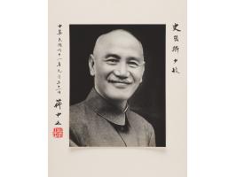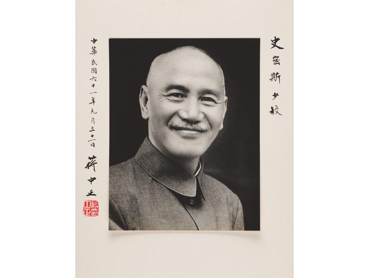 Impressive oversized semi-glossy 7.5 x 9.5 photo of Chiang Kai-shek, affixed to its original 11 x 13.75 mount, signed and inscribed on the mount in black ink in Chinese. The photograph is presented in a beautiful red felt “Souvenir of Taiwan” album, 19 x 13, containing three documents and a photograph issued to Major Richard M. Smith, Jr., who served as a communications–electronics officer with the U.S. Military Assistance Advisory Group (MAAG) in Taiwan in the late 1960s, early 1970s. In fine condition. An exceptional portrait of the Chinese leader, very scarce in this large-format size.
