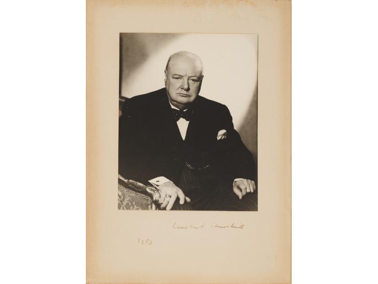 Iconic matte-finish 5 x 6.5 portrait of Winston Churchill by Vivienne of London, affixed to its original 7.75 x 10.5 studio mount, signed on the mount in fountain pen, "Winston S. Churchill, 1953." Affixed inside its original studio presentation folder, the reverse of which bears a “Vivienne, 20th Century Studios Limited” copyright stamp. In fine condition, with toning to the edges of the mount.
