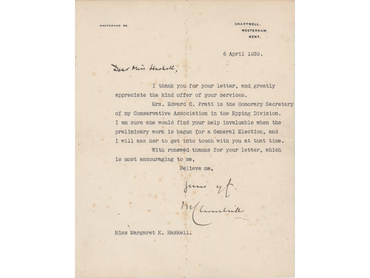 TLS signed “W. S. Churchill,” one page, 8 x 10, Chartwell, Westerham, Kent letterhead, April 6, 1939. Letter to Margaret K. Haskell, in full: “I thank you for your letter, and greatly appreciate the kind offer of your services. Mrs. Edward C. Pratt is the Honorary Secretary of my Conservative Association in the Epping Division. I am sure she would find your help invaluable when the preliminary work is begun for a General Election, and I will ask her to get into touch with you at that time. With renewed thanks for your letter, which is most encouraging to me.” In very good to fine condition, with scattered light foxing.