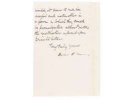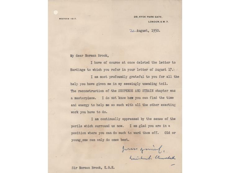 TLS signed "Yours sincerely, Winston S. Churchill," one page, 7.25 x 9.5, 28 Hyde Park Gate, [London] letterhead, August 22 1950. Letter to Cabinet Secretary Norman Brook, in full: "I have of course at once deleted the letter to Hardinge to which you refer in your letter of August 17. I am most profoundly grateful to you for all the help you have given me in my seemingly unending toil. The reconstruction of the SUSPENSE AND STRAIN chapter was a masterpiece. I do not know how you can find the time and energy to help me so much with all the other exacting work you have to do. I am continually oppressed by the sense of the perils which surround us now. I am glad you are in a position where you can do much to ward them off. Old or young, one can only do ones best." Affixed to a same-size backing sheet and in very good condition, with light staining and overall wrinkling from mounting.
