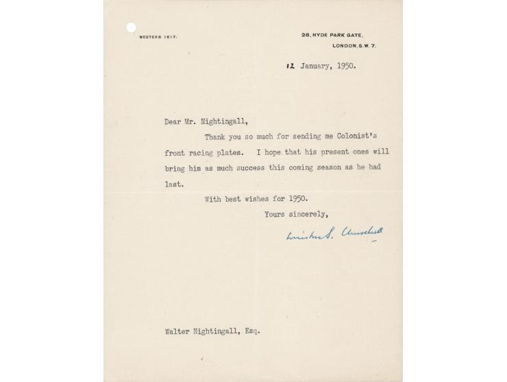 TLS signed "Winston S. Churchill," one page, 7.5 x 9.5, 28 Hyde Park Gate [London] letterhead, January 12, 1950. Letter to his racehorse trainer, Walter Nightingall, in full: "Thank you so much for sending me Colonist's front racing plates. I hope that his present ones will bring him as much success this coming season as he had last. With best wishes for 1950." In fine condition.