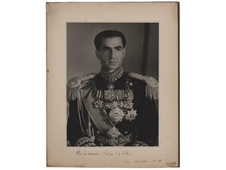 Vintage matte-finish 6.75 x 9 photo of Mohammad Reza Pahlavi in decorated uniform, affixed to its original 9.5 x 12 mount, signed on the mount in fountain pen, "Mohammad Reza Pahlavi, 20 Octobre 1954." Blindstamped in the lower right corner by the photographer, "Sako." In fine condition, with small stains to the mount, all easily matted out.