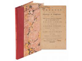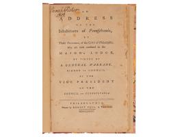 Scarce book: An Address to the Inhabitants of Pennsylvania, by Those Freemen, of the City of Philadelphia, who are now confined in the Mason's Lodge, by virtue of a General Warrant Signed in Council by the Vice President of the Council of Pennsylvania. Philadelphia: Robert Bell, 1777. Rebound hardcover in quarter morocco with marbled boards, 5.25 x 8.25, 52 pages. The text, signed in type by Israel Pemberton and twenty-one others, includes copies of orders of the Supreme Executive Council, remonstrances addressed to the Council, and other papers upon the state's arrest of Quakers (including himself) on suspicion of Loyalist sympathies during the Revolutionary War, and their confinement without a hearing or trial. Book condition: VG/None, with mottled foxing to textblock and an ownership inscription ("Sarah Fisher, 1808") to title page.