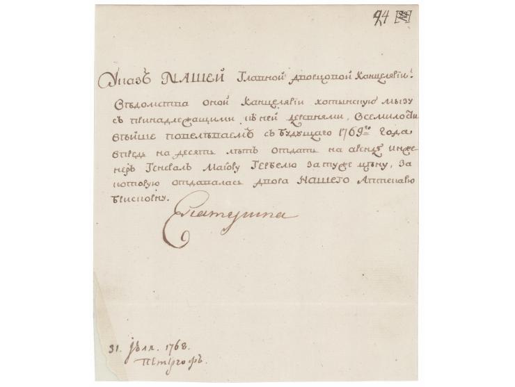 Manuscript DS in Cyrillic, signed "Ekaterina,” one page, 6.75 x 7.75, July 31, 1768. Addressed from Peterhof Palace, an imperial order entitled “Ukaz of OUR Main Palace Chancellery,” which directs the chancellery to lease the Khotyn estate, together with its associated villages, to Engineer General Major Gerbel for ten years beginning in 1769, at the same price previously paid for the lease of the Appellate Court. Signed beautifully at the conclusion by Catherine the Great. In fine condition, with trimmed edges, and reinforced loss to the lower left corner tip.