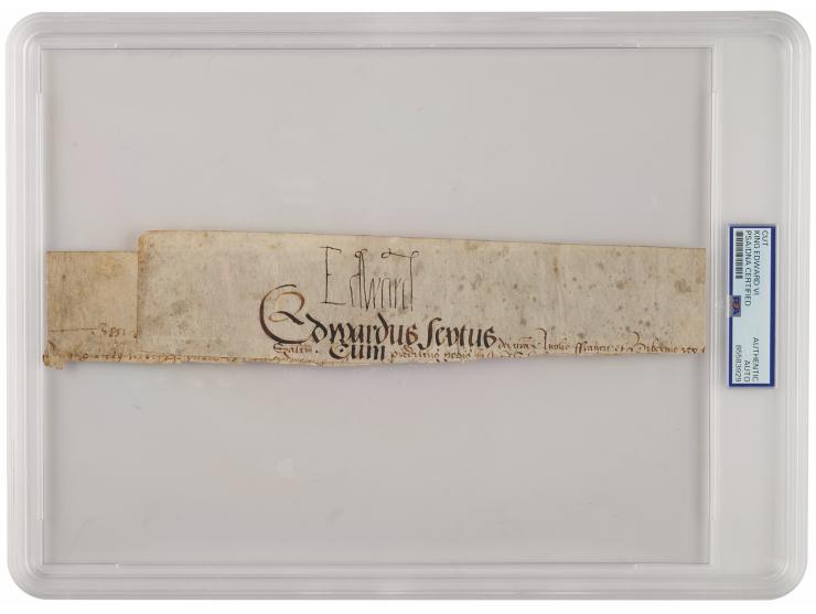 Large and neat ink signature, "Edward,” on a long off-white vellum slip cut from the top of a manuscript document, folded to 10.75 x 2. In very good to fine condition, with scattered staining and soiling. Encapsulated in a PSA/DNA authentication holder.