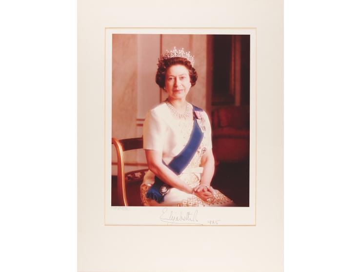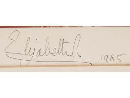 Color semi-glossy 12 x 15 photo of Queen Elizabeth II wearing her crown jewels and Order of the Garter sash, affixed to its original 13 x 17 studio mount, signed on the mount in ink, "Elizabeth R, 1985." Also signed on the mount in pencil by the photographer, "Anthony Buckley and Constantine, London." Matted to an overall size of 18 x 24. In very fine condition.