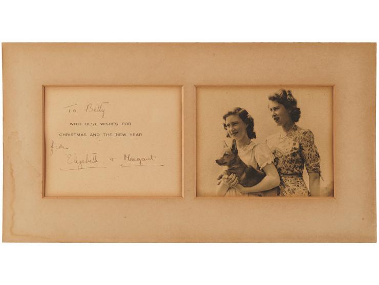 Vintage circa 1940s Christmas card depicting the young Princess Elizabeth and Princess Margaret with a beloved corgi, measuring 11.75 x 5 open, signed and inscribed around the printed greeting in fountain pen, "To Betty, from Elizabeth" and "Margaret." Matted to an overall size of 13.5 x 7. In very good to fine condition, with edge toning to the card, and toning and damstaining to the mat.