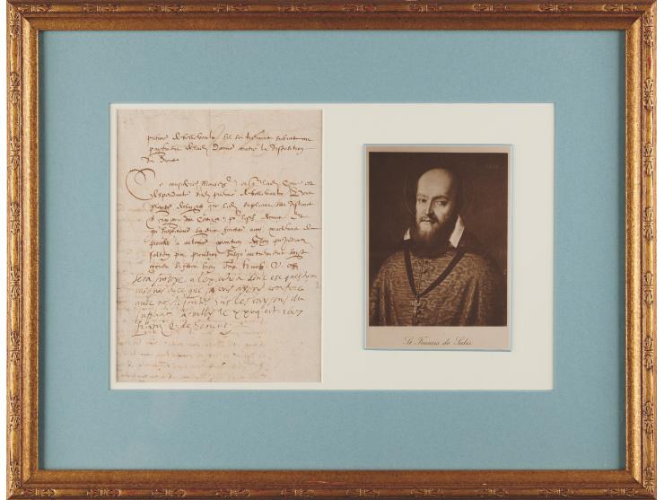 Extremely rare ANS in French, signed “Franc's ev. De Geneve,” penned at the conclusion of a manuscript appeal for tax exemption, one page both sides, 6 x 8, October 27, 1607. The appeal, sent to de Sales while serving as Bishop of Geneva, requests for an exemption from ecclesiastical taxes. Addressed from the Swiss town of Villy, near the Lake Geneva town Evian, where de Sales was reputed to have seen a vision of St. Francis of Assisi, the Bishop’s handwritten response reads: “Exacting of taxes suspended until we have had a chance to confer with Our deputies on the reasons of the petitioner.” Double-matted and framed with a portrait to an overall size of 19 x 14.75; a window to the frame backing reveals the front of the appeal. In fine condition. Since 1536, Geneva had retained taxes formerly rendered to the Catholic Church, and the practice of ecclesiastical taxation was being challenged across Europe by the end of the 16th century.