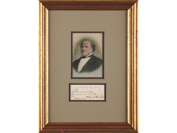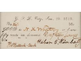 Rare partly-printed note of Mormon currency in the amount of fifty cents, 3.5 x 1.75, made out in another hand to N. K. Whitney, and signed in ink by three early Mormon leaders, "Brigham Young," "Heber C. Kimball," and "Tho. Bullock—Clerk." The note is number 867, issued at Great Salt Lake City on January 20, 1849. Handsomely double-matted and framed with a postcard portrait to an overall size of 10.5 x 14.25. In fine condition.