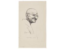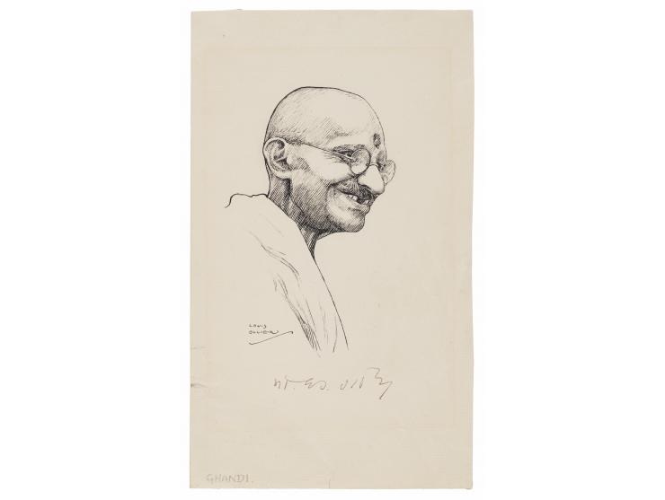 Attractive portrait sketch of Mohandas Gandhi by artist Louis Ollier, accomplished in ink on an off-white 5 x 8.5 sheet, signed neatly below in ink by the Mahatma, who has signed his name in Hindi. Includes a letter of transmittal from Gandhi’s secretary, Mahadev Desai, dated December 29, 1934, sent from “The Ashram,” in full: “Your sketch of Gandhi has been with me for some time and I am sorry. Pressure of work has not permitted me to place it before him earlier. He has now autographed it. It’s his signature in Hindi. I hope you do not mind it.” In fine condition, with a few short edge tears, and some light toning from prior display, all easily matted out.