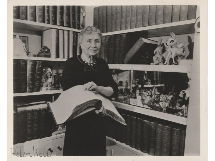 Vintage glossy 10 x 8 photo of Helen Keller holding a huge book of braille, neatly signed in the lower left in pencil. In fine condition.
