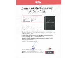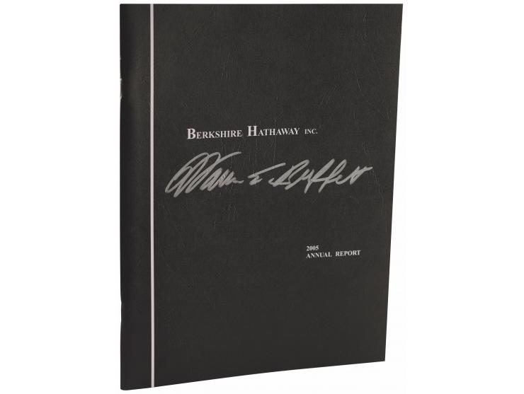 Rare softcover Berkshire Hathaway Inc. annual report from 2005, 80 pages, 8.25 x 10.75, signed on the front cover in attractive silver ink, "Warren E. Buffett." The report opens with one of Buffett's popular shareholder letters, offering his fascinating insights into the state of Berkshire and of the economy at large. In fine condition. Accompanied by a full letter of authenticity from PSA, which grades the autograph as a "10."