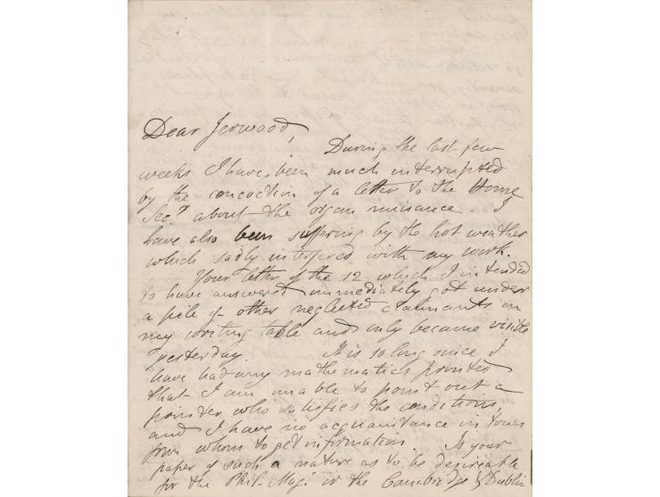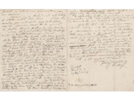 ALS signed “C. Babbage,” three pages on two adjoining sheets, 7.25 x 9, August 29, 1861. Handwritten letter to "Jerwood," mentioning his work on the Analytical Engine and signals for ship navigation, while complaining about the Royal Society. In part: "I am steadily working at the Anal. Eng. as far as health and means admit. My occulting signals after being ignored for two years seem likely to be put in practice. I have observed for some time that various schemers had proposed lights for night signals and I knew they could not use them with success without employing my occulting and blinking lights…The French Minister or Marine has made a contract for eight electric lights to be placed along the court of the channel. 'The object of these lights is to maintain a communication with ships within light of land, and to transmit the news rapidly to the interior.' As to the R.S., the council have recommended Sabine—to the great disgust of Murchison, and as one of the fellows tells me, also to the great disappointment of a certain other fellow, Dr. Granville. The R.S. has treated me upon several occasions with the greatest injustice: but I had no conception that it could ever have been reduced to such a degraded position." In fine condition.