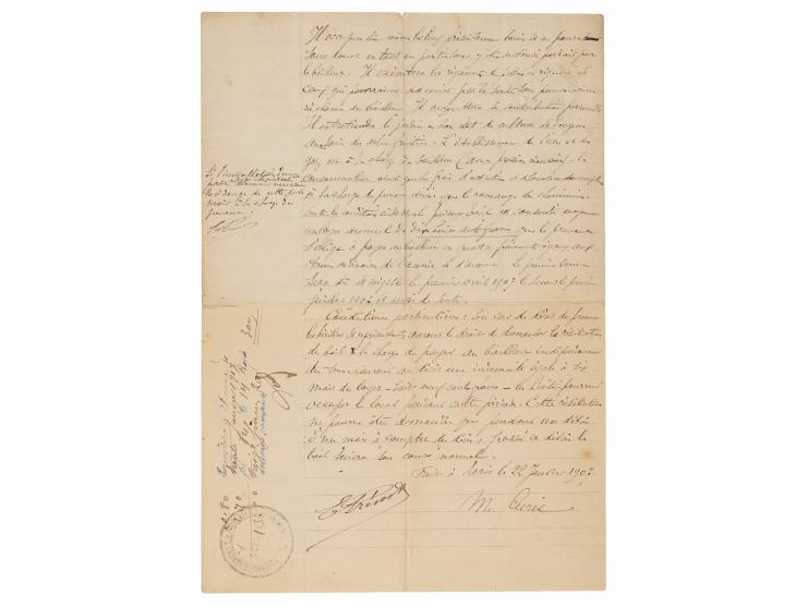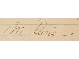 Manuscript DS in French, signed “M. Curie,” one page both sides, 6.75 x 9.75, January 22, 1907. Document pertaining to the lease of a property. In full (translated): "Between the undersigned, it has been agreed as follows: