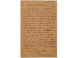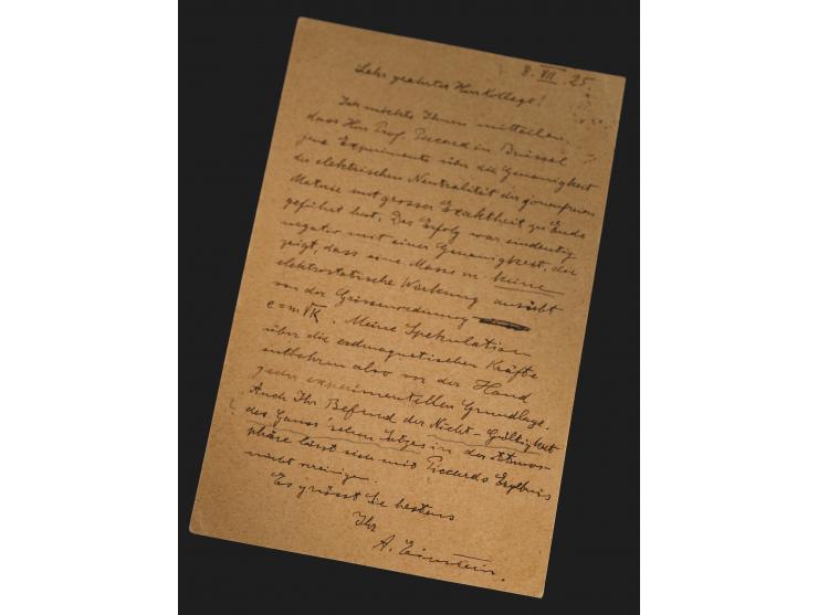 ALS in German, signed “A. Einstein,” one page, 3.5 x 5.5, July 8, 1925. Handwritten letter to Professor Albert Wigand at the University of Halle, in full (translated): "I would like to inform you that Prof. Piccard in Brussels has completed those experiments on the accuracy of the electrical neutrality of matter with great precision. The result was clearly negative with an accuracy that shows that mass exerts no electrostatic effect of the order of magnitude e=m√K. My speculation about geomagnetical forces therefore lacks any experimental basis for the time being. Your finding of the non-validity of Gauss's law in the atmosphere cannot be reconciled with Piccard's result either." Addressed on the reverse in Einstein's hand. In fine condition.