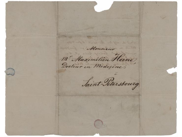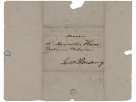Hand-addressed mailing cover accomplished by Heinrich Heine, measuring 10.5 x 8.5 open, with a central panel of 5 x 3.75, addressed by Heine to his brother: "Monsieur Mr. Maximilien Heine, Docteur en Medecine, Saint-Petersbourg." On the reverse is a handwritten note by Maximilian Heine, dated November 1865, identifying the handwriting as that of his brother. In fine condition, with tears and seal-related loss to the wide borders.