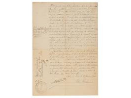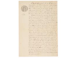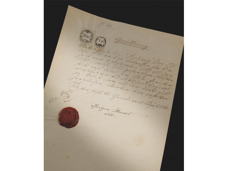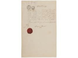 Rare manuscript DS in German, one page, 8.5 x 13.75, 1868. Receipt document concerning a financial transaction, issued from St. Thomas's Abbey in Brno. In full (translated): "For 63 florins, that is, sixty-three Austrian guldens, at 5 % interest, for the period from 1 September 1867 up to now in 1868, that the satisfied monastery has received in cash from the endowment capital of 1200 convention florins secured by the Pernstein manor and the manorial rights there." An official embossed red wax seal is affixed to the lower left, with two revenue stamps affixed near the top. In fine condition.