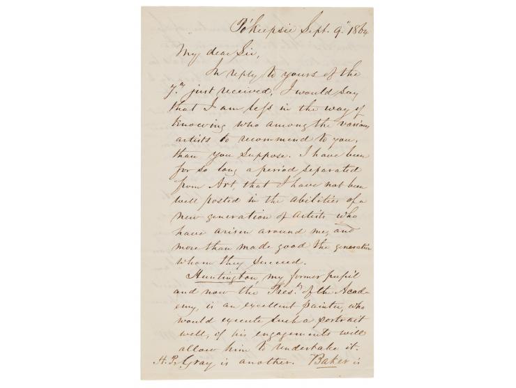 An interesting letter in which Morse acknowledges his 'past life' as a successful painter, renowned for portraits of the likes of John Adams, James Monroe, and the Marquis de Lafayette. Here, he recommends three artists for a potential commission: Daniel Huntington and Henry Peters Gray, both of whom had studied under Morse; and George Baker, an excellent portrait painter and popular miniaturist.