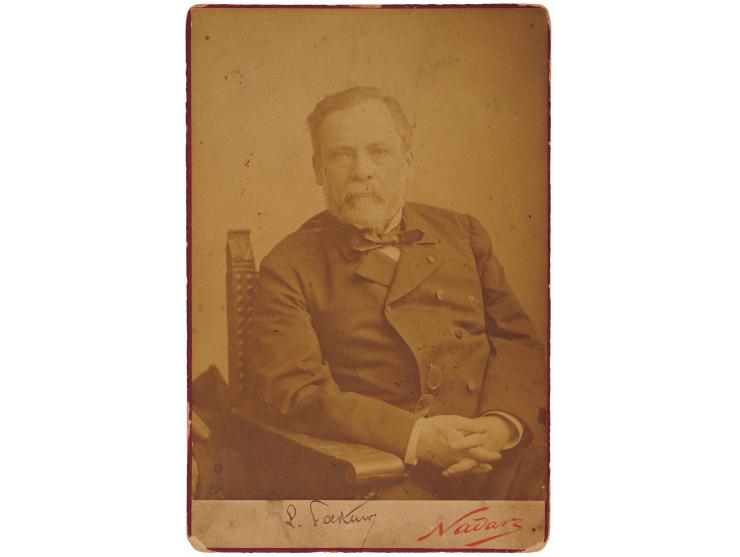 Scarce 4.25 x 6.5 cabinet photo of the celebrated scientist by Nadar of Paris, signed on the mount in ink, "L. Pasteur." In very good to fine condition, with small stains, light scuffing and soiling, and some minor edge chipping.