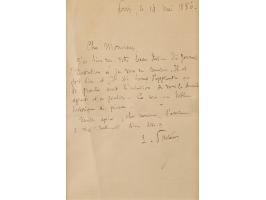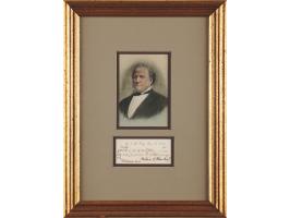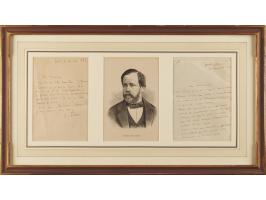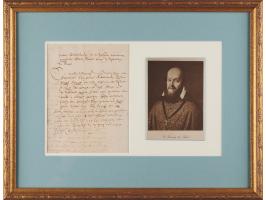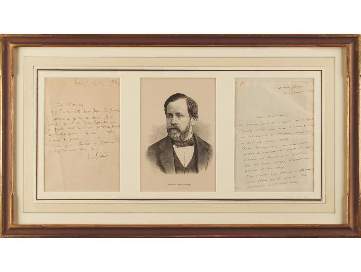 ALS in French, signed “L. Pasteur,” one page, 4.5 x 6.75, May 14, 1886. Handwritten letter expressing his appreciation for an illustration by A. Gerardin, which appeared in the French illustrated weekly newspaper L'Illustration in 1886 and showed some of the rabies patients under his care. Matted and framed with an engraved portrait and an explanatory letter by his son-in-law, René Vallery-Radot, to an overall size of 21.25 x 12. In fine condition.