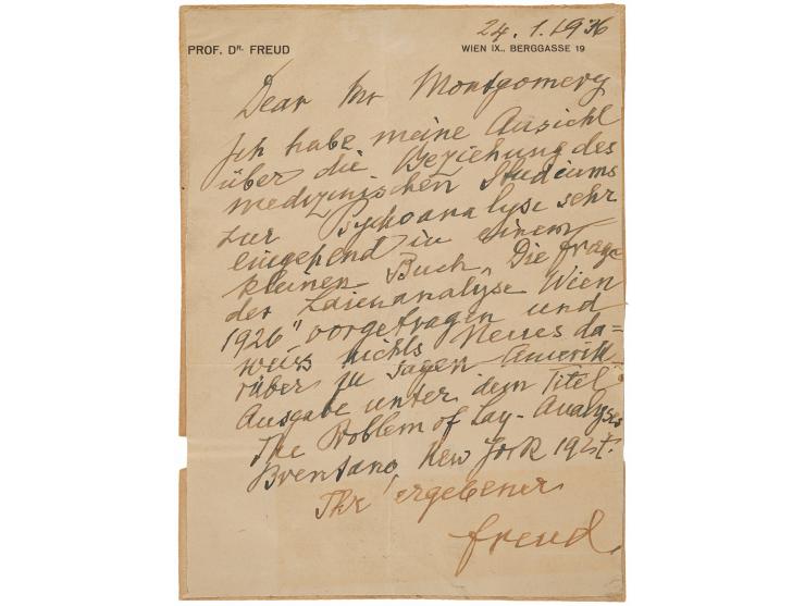ALS in German, signed “Freud,” one page, 5.25 x 7.25, personal letterhead, January 24, 1936. Handwritten letter to "Mr. Montgomery," in part (translated): "I have expounded my view on the relationship of medical studies to psychoanalysis in great detail in a small book, 'The Question of Lay Analysis,' Vienna 1926, and have nothing new to add to it." Backed by two separated mounts and in good to very good condition, with trimmed edges, toning, and some splitting to the folds.