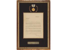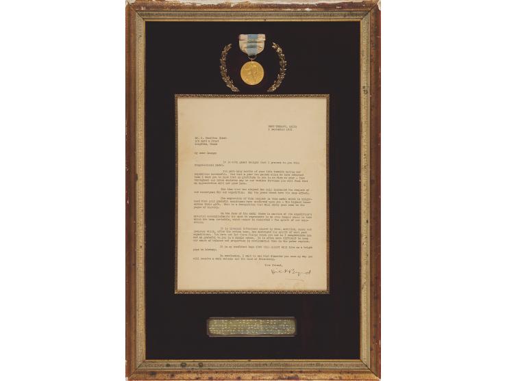 The medal is presented with its original transmittal TLS from Admiral Byrd, signed “Dick Byrd,” one page, 8.25 x 10.75, September 1, 1931. Addressed from West Tremont, Maine, the letter reads, in full: “It is with great delight that I present to you this Congressional Medal. You gave many months of your life towards making our expedition successful. Now that a year has passed since we have returned home I want you to know that my gratitude to you is as firm as ever — that throughout our lives whatever may be our various fortunes you will find that my appreciation will not grow less. The time that has elapsed has only increased the respect of our countrymen for our expedition. May the years ahead have the same effect.