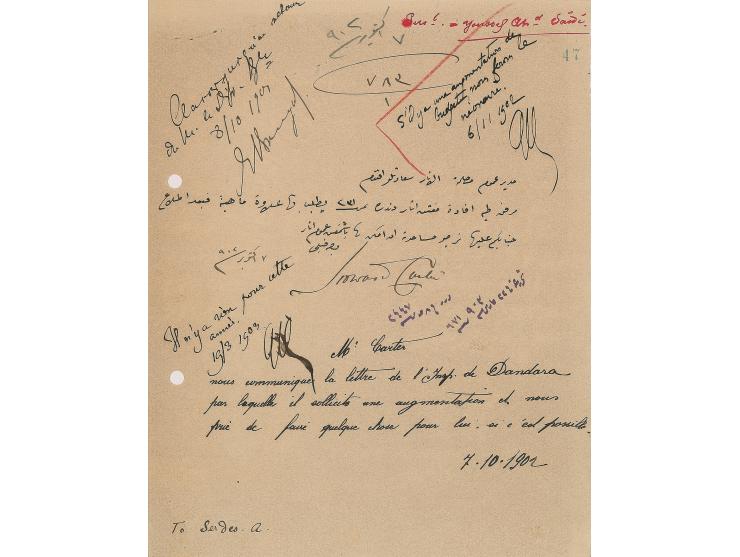 Manuscript DS, one page, 7 x 9, 1902. Document concerning a pay raise for a tomb guard, signed by Carter to approve the request. Also initialed twice by prominent Egyptologist Gaston Maspero. In fine condition, with pin holes to upper left corner and two file holes along the left edge.