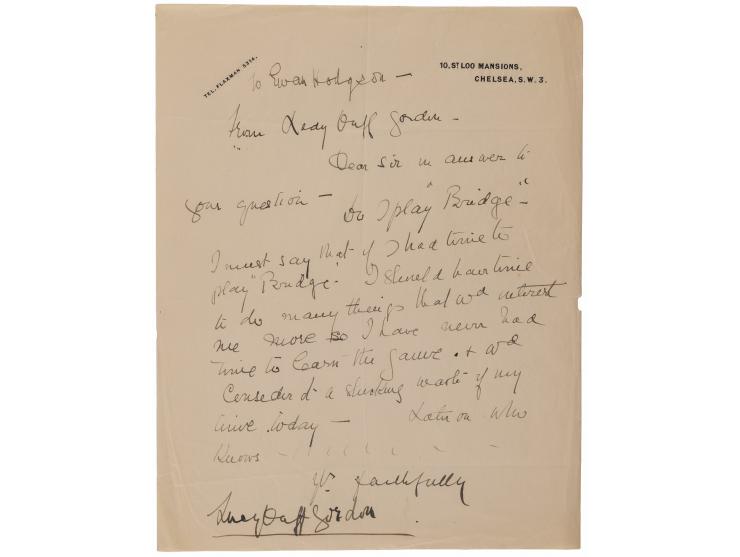 ALS signed “Lucy Duff-Gordon,” one page, 7.75 x 10, 10 St. Loo Mansions letterhead, no date. Handwritten letter, headed: "To Evan Hodgson—From Lady Duff Gordon," in full: "In answer to your question—Do I play 'Bridge'—I must say that if I had time to play 'Bridge,' I should have time to do many things that w'd interest me more so I have never had time to learn the game & w'd consider it a shocking waste of my time today—later on who knows." In fine condition.