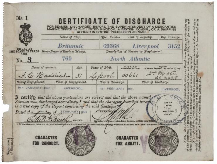 Partly-printed DS, signed “Edw'd J. Smith,” one page, 8 x 6, February 1, 1895. Certificate of discharge issued to F. C. Raddish, a second mate on board the Britannic. Printed near the bottom is a certification statement which reads, “I certify that the above particulars are correct and that the above named Seaman was discharged accordingly, and that the character described hereon is a true copy of the Report concerning the said Seaman.” Signed at the conclusion of the statement by Smith as the vessel’s master, and countersigned by a shipping representative. In fine condition, with faint toning along the left edge.