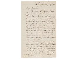 ALS signed “Sam'l F. B. Morse,” four pages on two adjoining sheets, 5 x 8, September 9, 1864. Handwritten letter to William Stickney, a co-founder of the Columbia Institution for the Deaf (now Gallaudet University). In part: "In reply to yours of the 7th just received, I would say that I am less in the way of knowing who among the various artists to recommend to you, than you suppose. I have been for so long a period separated from Art, that I have not been well posted in the abilities of a new generation of artists who have arisen around me, and more than made good the generation whom they succeed.