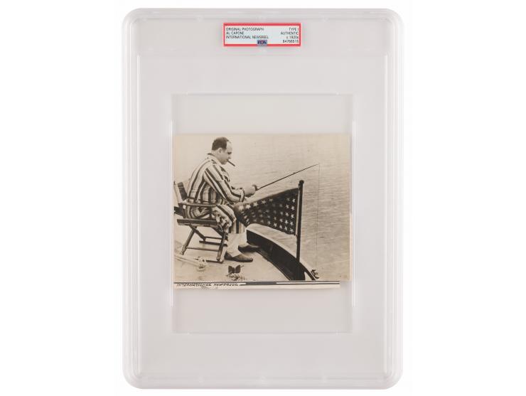 Original vintage pearl-finish 6.25 x 5.5 photo of Chicago Outfit crime boss Al Capone shown wearing a striped robe, smoking a cigar, and fishing from his yacht moored at his winter residence in Palm Island, Miami Beach. The lower margin is marked “International Newsreel.” In very good to fine condition, with trimming to the edges. Encapsulated by PSA as an authentic "Type I" photograph, circa 1920s.