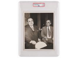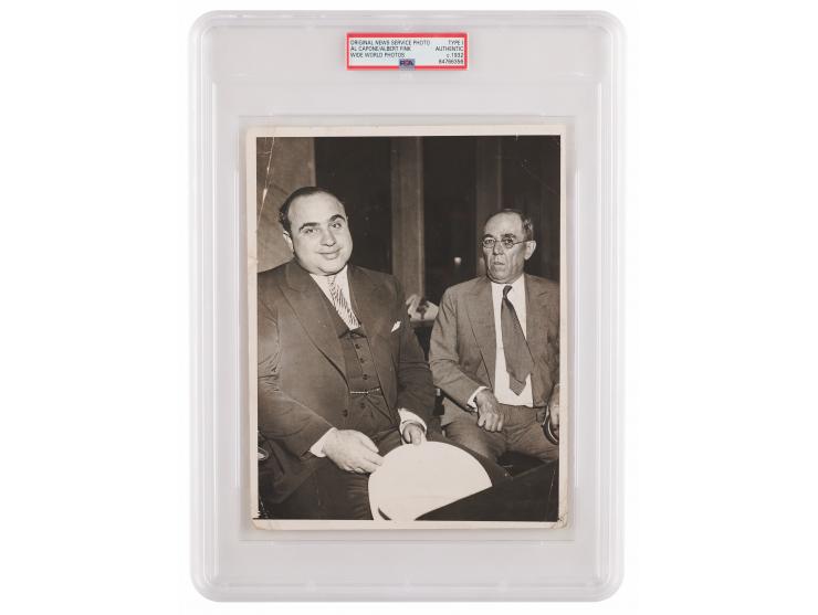 Original vintage glossy 7 x 9 news service photograph of Al Capone seated with one of his attorneys, Albert Fink, in a Chicago courthouse before he was convicted on five counts of income tax evasion on October 17, 1931. The reverse bears various stamps, clippings, and editorial notations. In very good condition, with creasing to the sides, and surface impressions from copious information on the back. Encapsulated by PSA as an authentic 'Type I' photograph from circa 1932.