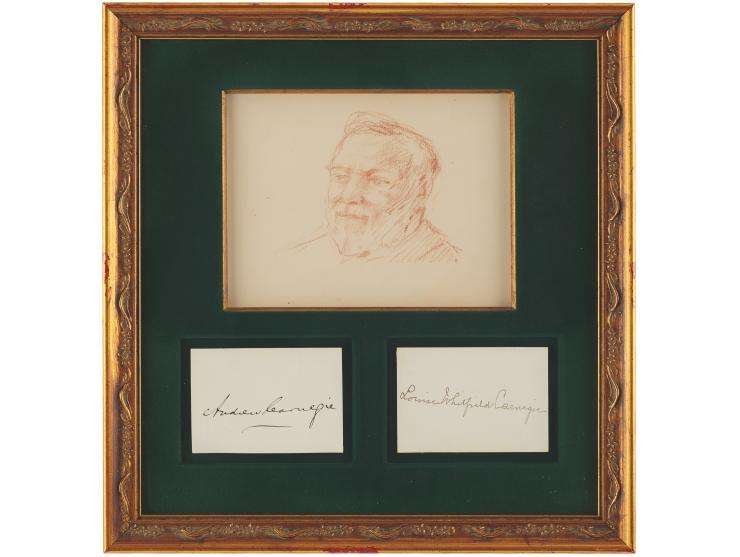 Nice ink signatures of the famous steel industrialist, "Andrew Carnegie,” and his wife, "Louise Whitfield Carnegie," on individual off-white 3 x 2.25 cards, mounted, suede-matted, and framed with a portrait of Carnegie to an overall size of 11 x 11.5. In overall fine condition.