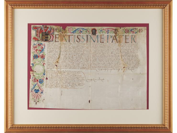 Vellum manuscript DS in Latin, signed by Cardinal St. Praxedis, Antonio Ciocchi del Monte, one page, 18.5 x 13, circa 1528. An ecclesiastical indulgence granting, among other things, the privilege of a secular confessor to the nobles Theseus and Guido de Sesso. All privileges are granted except where forbidden by the famous papal bull entitled In cena Domini. The top inside borders of the document are decorated with foliage and stylized flowers, in red, blue, pink, green, white, and black with slight gold illumination. A bearded head of Christ, encompassed by a cross nimbus, is set in the middle of the top margin, above the introductory line "Beatissime Pater." Mounted, matted, and framed to an overall size of 26.5 x 21. In very good to fine condition, with some staining, and scattered small areas of loss.