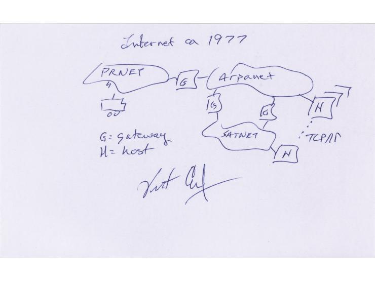 Original sketch by Vint Cerf of the “Internet ca. 1977,” accomplished in blue ballpoint on a white 8 x 5 card, signed at the bottom, "Vint Cerf." The sketch shows a basic diagram of the gateways and hosts connecting PRNET, ARPANET, and SATNET. In very fine condition.