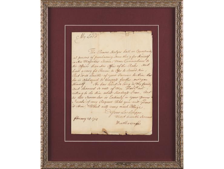 LS signed "Marlborough," one page, 7.25 x 9.5, February 25, 1718. Letter to a Lord, in part: "The Bearer Hodges hath an opportunity at present of purchasing something for Himself in His Majesties Service, more commodious to His Affairs than for his Office of the Robes. And hath a very fit person to offer to succeed him, but is so sensible of your favors to Him that he is ashamed to trespass farther on you himself." Matted and framed to an overall size of 13 x 15.25. In very good to fine condition, with some short edge tears.