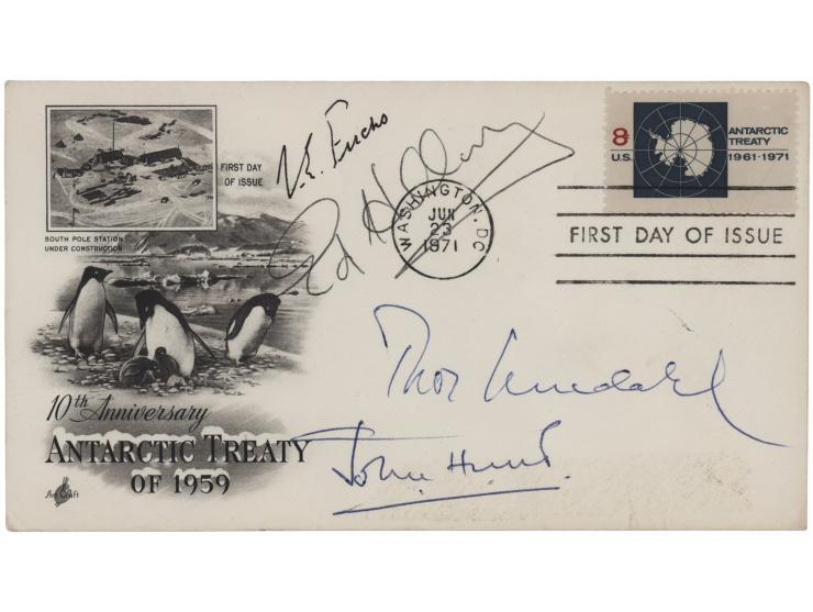 FDC with a cachet honoring the Antarctic Treaty, signed in ink by Edmund Hillary, John Hunt, Thor Heyerdahl, and Vivian Fuchs. In fine condition.