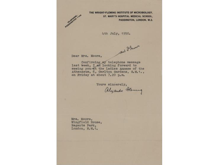 TLS, one page, 5.5 x 8.5, The Wright-Fleming Institute of Microbiology letterhead, July 4, 1950. Letter to "Mrs. Moore," in full: "Confirming my telephone message last week, I am looking forward to seeing you at the Ladies Annexe of the Athenaeum, 6, Carlton Gardens, S.W.1., on Friday at about 7.20 p.m." At the top, Fleming writes "and Dr. Moore." In very good to fine condition, with some creasing, and an extra horizontal fold.