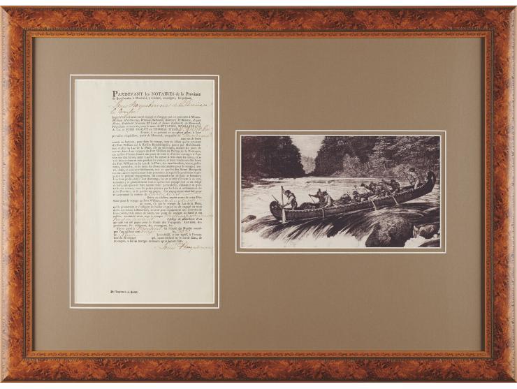 Rocquebrune will be paid 400 livres for the journey to Fort William and an additional 200 livres for the journey to Rain Lake, payable a month after his return to Montreal. Signed by Rocquebrune with his mark, an "X," over his name, written in another hand, at the conclusion of the document. Double-matted and framed with an image of the Voyageurs to an overall size of 27 x 20. In fine condition.