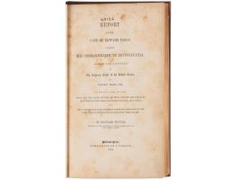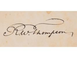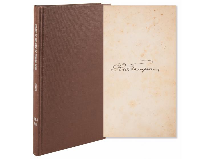 Signed book: Report of the Case of Edward Prigg Against the Commonwealth of Pennsylvania, Argued and Adjudged in the Supreme Court of the United States, by Richard Peters. First edition. Philadelphia: Stereotyped by L. Johnson, 1842. Hardcover in a 20th century library binding, 6 x 10, 140 pages. Signed on a free end page in ink by Congressman Richard Wigginton Thompson of Indiana, later Secretary of the Navy under Rutherford B. Hayes. In very good to fine condition, with mottled foxing to the textblock and ex-library markings, including a "George Peabody College for Teachers Library" bookplate to front pastedown.